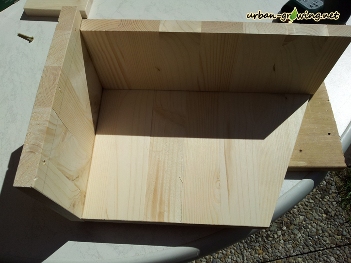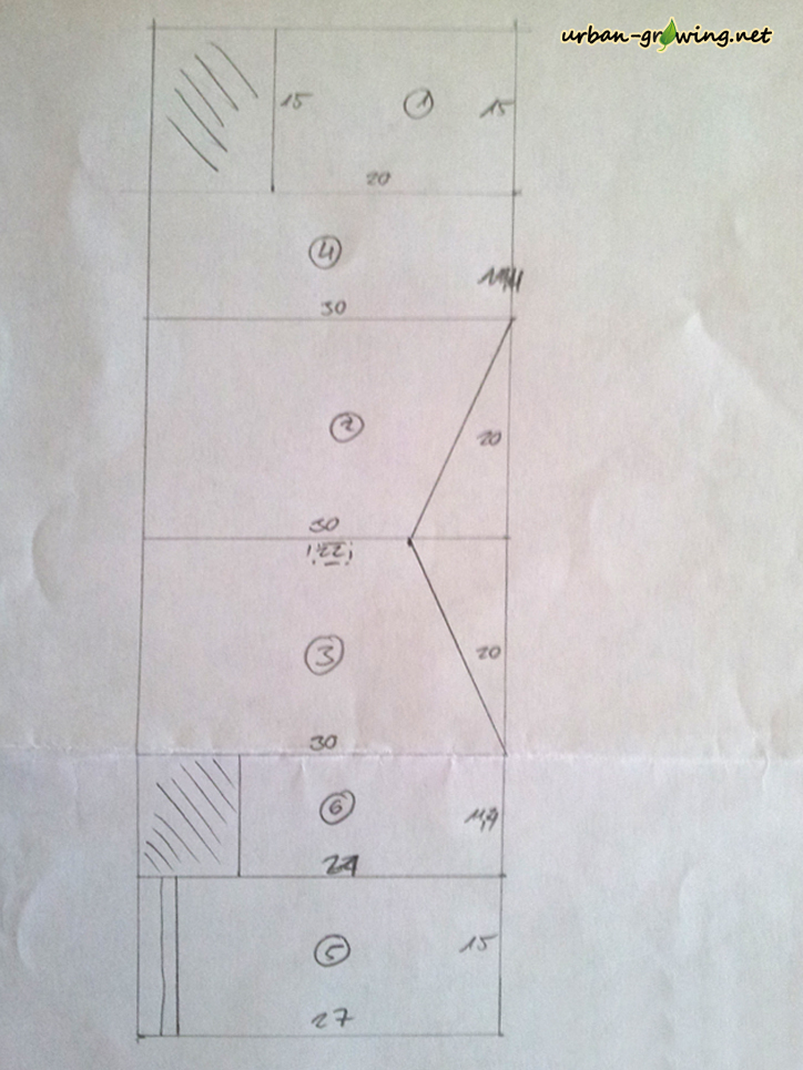 Die Breite der Seitenwände ist 20cm. Die hintere Höhe ist ebenfalls 20cm. Daraus ergibt sich eine Schräge mit dem Winkel von X° Grad. Nachdem ich für die Teile einen Schnittplan gezeichnet hatte, war die Winkelangabe für mich irrelevant.