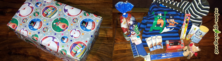 [Ein besonderer Dank an meine Frau, welche mich auf diese wunderbare Spendenaktion aufmerksam machte. Oben ist unser Schuhkarton. Für welches Kind an welchem Ort auch immer gibt es dieses Jahr: einen Schoko-Weihnachtsmann mit Schokokugeln, 3 Paar Wintersocken, 1 Schaal, 1 Mütze, 1 Spielzeugauto, 1 Zahnbürste mit Kindermotiv, 1 Kinder Badegeel, 1 Kinder Zahnpasta, 1 Monster-Pullover, 1 Lineal mit 2 Bleistiften und Radierer mit Spitzer, – und ein kleines Plüsch Rentier.]