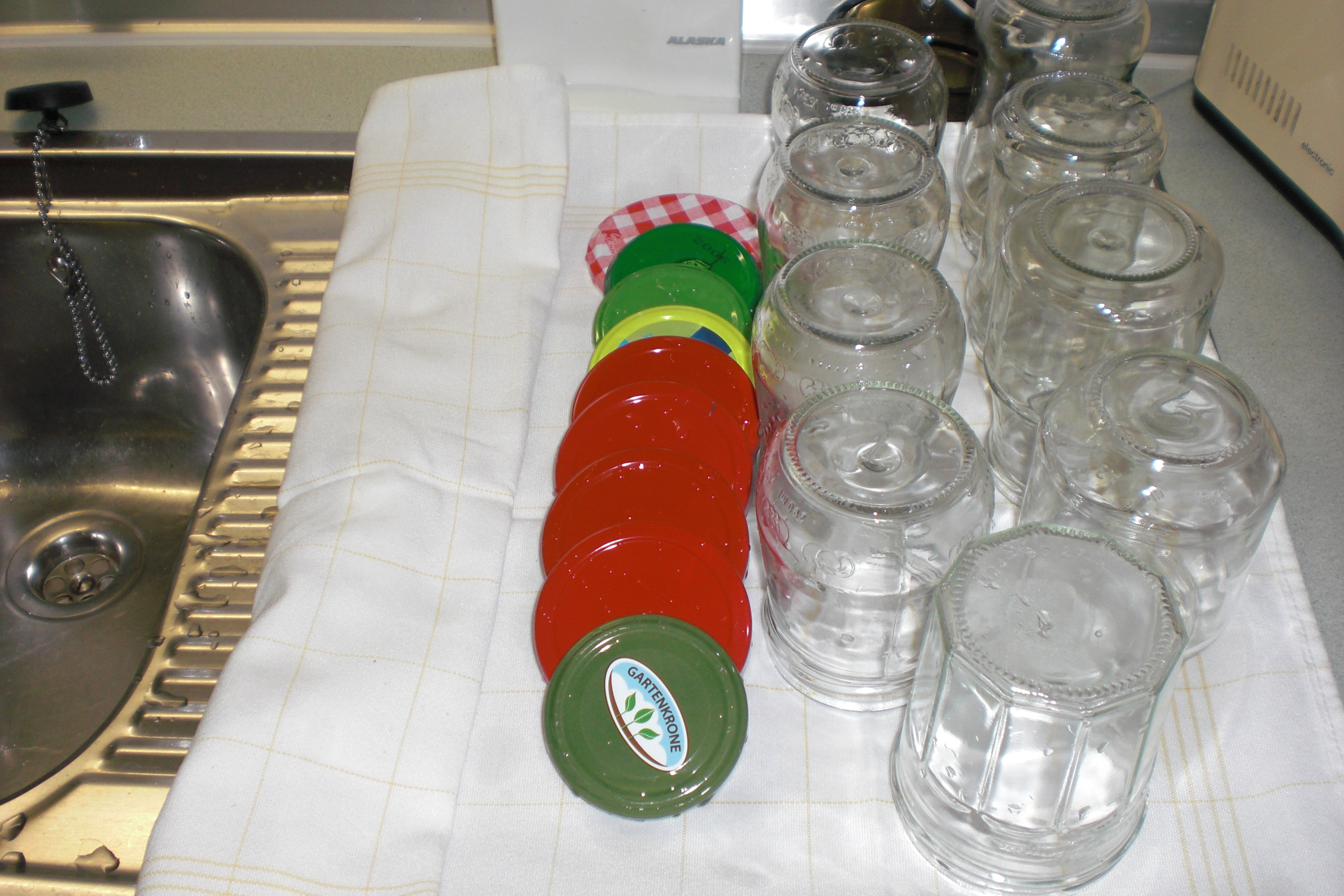 2. Marmeladengläser mit Schraubverschluß gründlich mit Bürste waschen, in klarem, heißem Wasser nachspülen, umgekehrt auf ein sauberes Küchentuch stellen, ebenso die Deckel (Bild 1 )