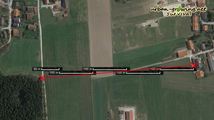 Bei meinem Nachttest habe ich bei gutem Wetter die Leistung voll ausgereizt. Die Distanz betrug [bei Nacht!] ca. 450m über freies Feld. Am Zielpunkt waren eindeutig Lichter, die Umrisse des Hauses sowie kurzzeitig eine einzelne Person auf dem Vorplatz sichtbar! – Der Screenshot zeigt euch die wirkliche Distanz bei Tag!
