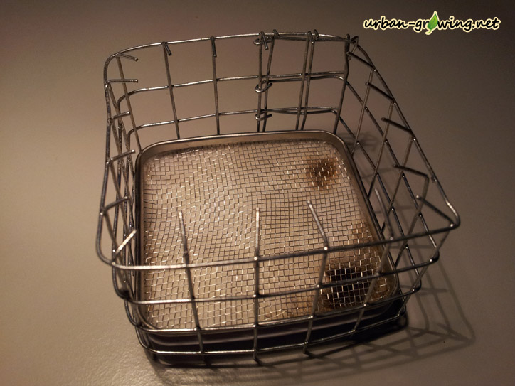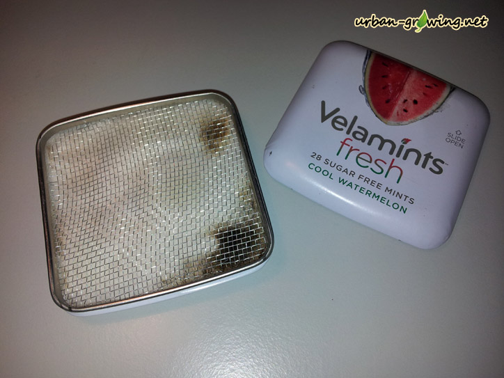 In eine leere Velamints Dose habe ich etwas zurecht geschnittene Watte gedrückt und mit einem Stückchen Fliegengitter aus Metall gesichert. Besser noch wäre ein Stückchen Steinwolle. Die brennt selbst nicht weg.