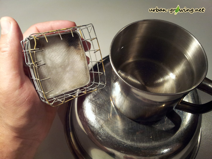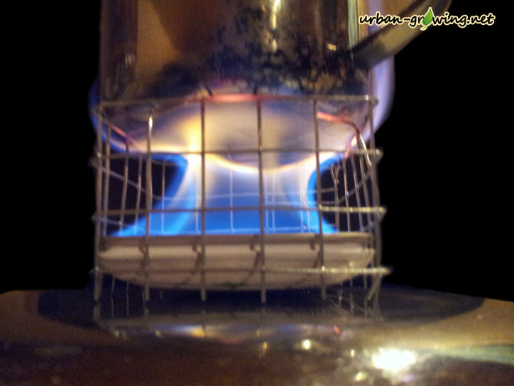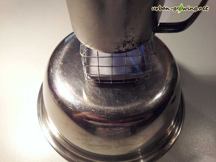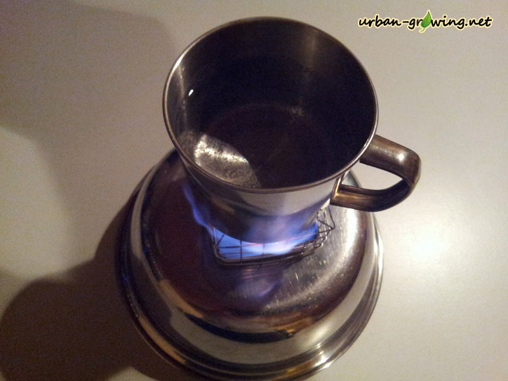 Nun muss ich nur noch den Deckel runter schieben und eine Flamme an das Gitter halten. Tasse drauf und los geht`s!