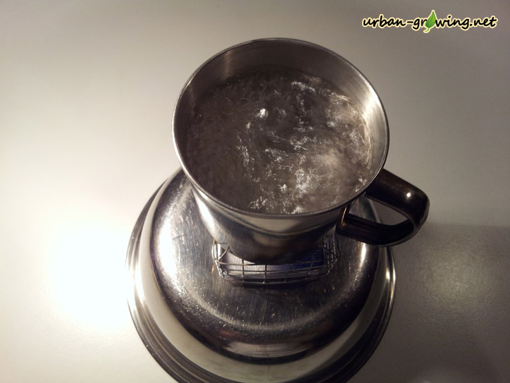 Die Watte habe ich mit Spiritus getränkt. Für einmal Wasser im Becher aufkochen reicht eine Deckelfüllung eines Schraubverschlusses einer normalen Wasser- oder Limoflasche.