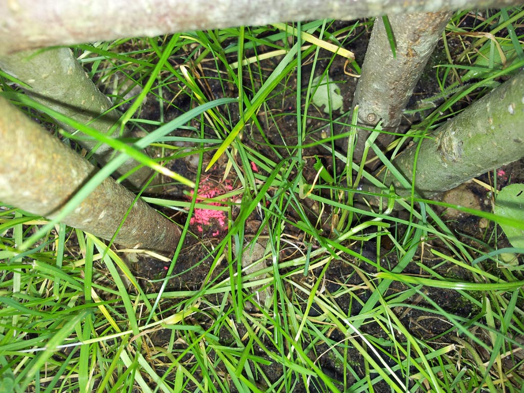 1.) Bemesst die Grundfläche mit ca. 1,50m – 1,80m im Durchmesser und markiert die Steckpunkte mit Markierspray. Für einen Kreis steckt ihr einen Pfahl / Pflock in die Mitte, bindet eine Schnur daran und zirkelt euer Weidentipi aus.