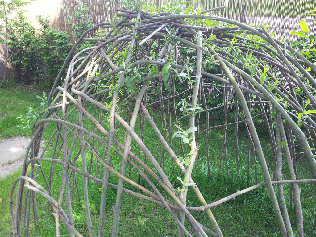 10.) Haben die Stecklinge gewurzelt, bildet sich über den Sommer reichlich Laub, welches das Weidentipi mit der Zeit komplett eindeckt.